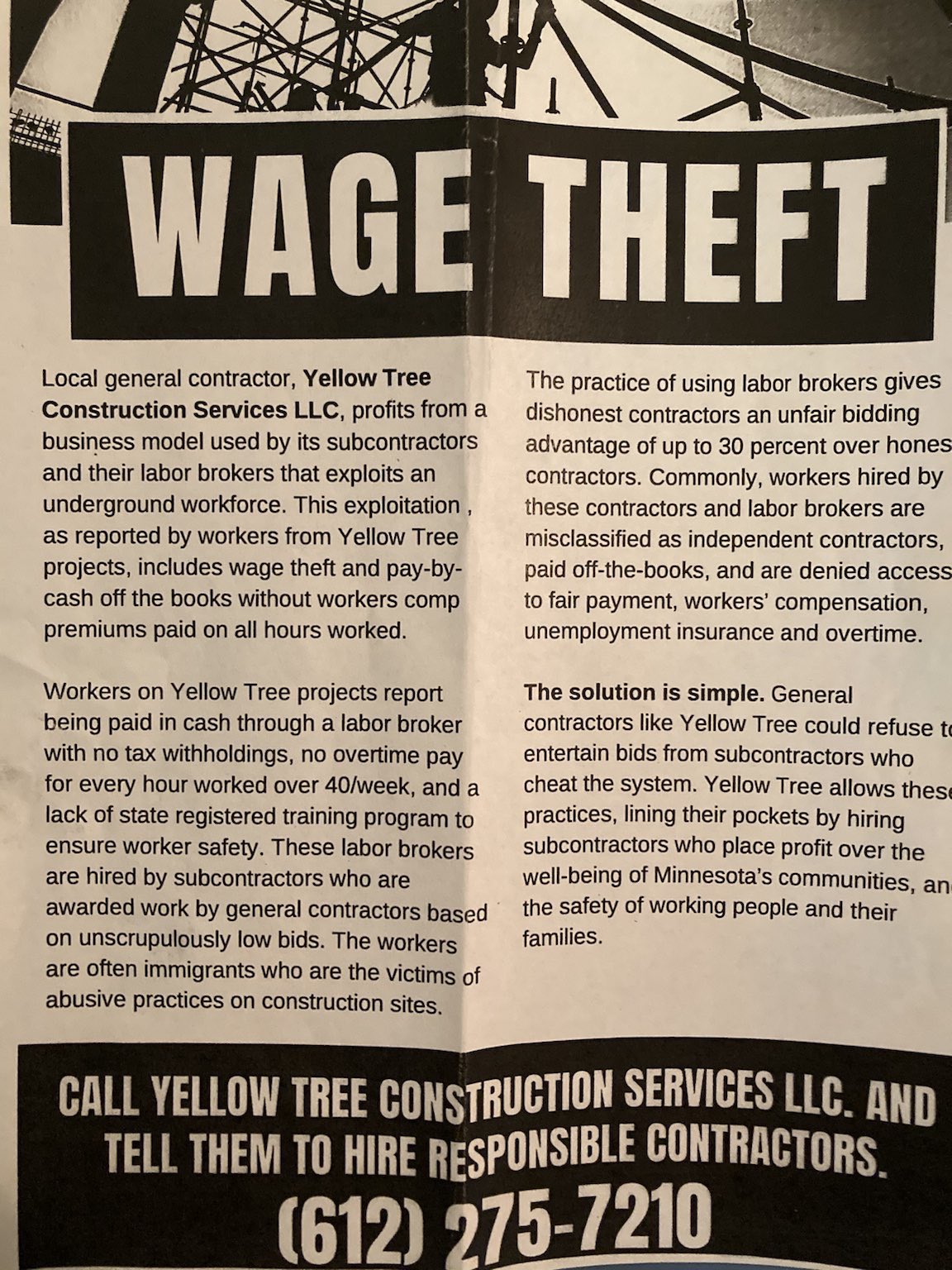 Twin Cities Workers Defense Alliance On Twitter Phone Zap Yellow Tree Construction Is Exploiting Underground Workers All Shares Of This Flyer And All Calls To Yellow Tree Would Be Very Appreciated